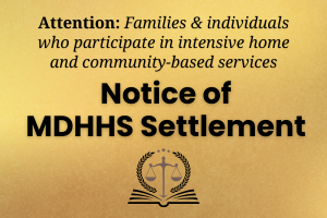 Settlement Notice ATTENTION: Families and individuals who participate in intensive home and community-based services The Michigan Department of Health and Human Services (MDHHS) has received preliminary court approval for the settlement of litigation alleging that medically necessary intensive home and community-based services were not timely provided to Medicaid-eligible children and youth as required by Medicaid’s…