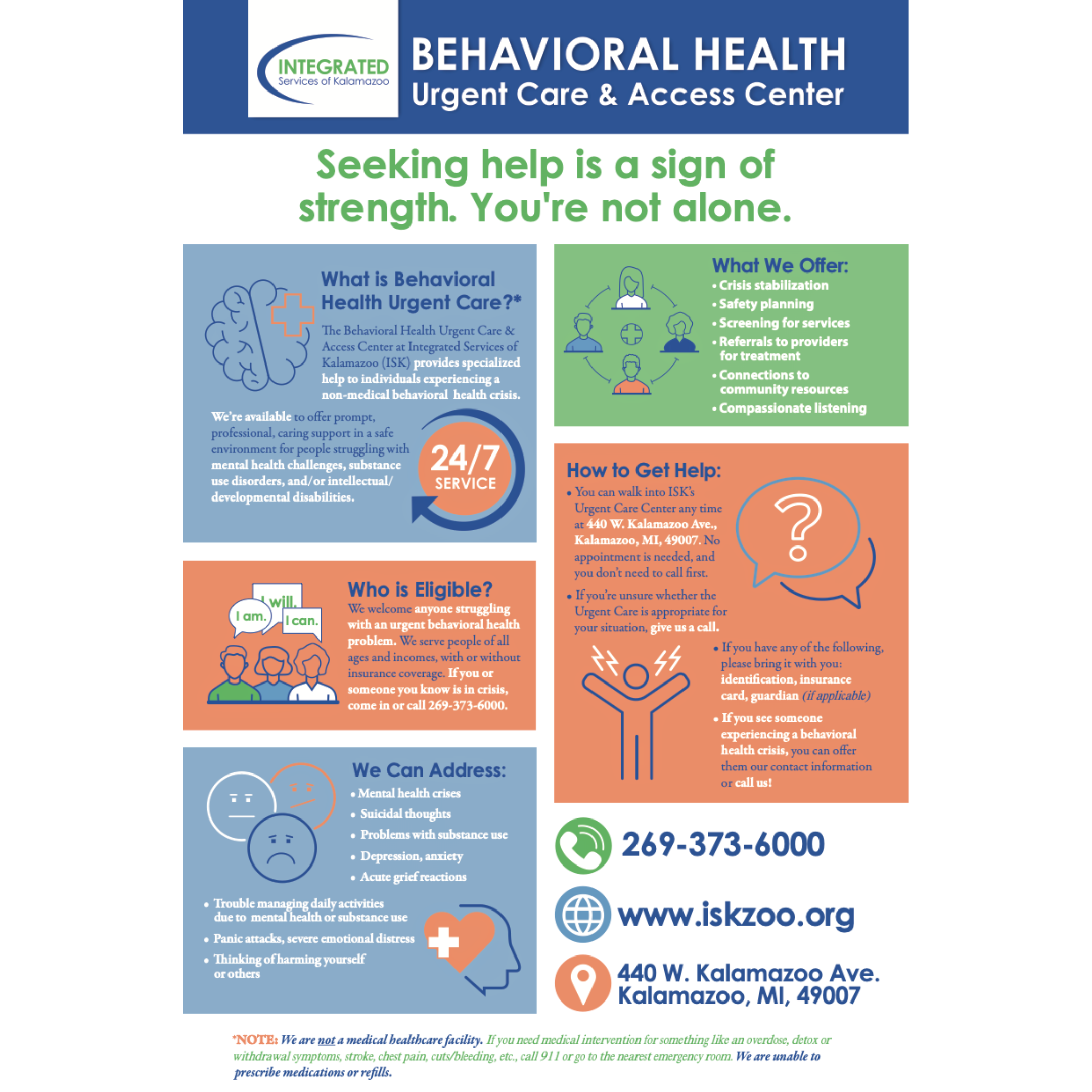 ISK’s Behavioral Health Urgent Care provides specialized help to individuals of all ages experiencing a non-medical* behavioral health crisis. We’re located at 440 W. Kalamazoo Ave., Kalamazoo MI 49007. Phone: 269-373-6000.