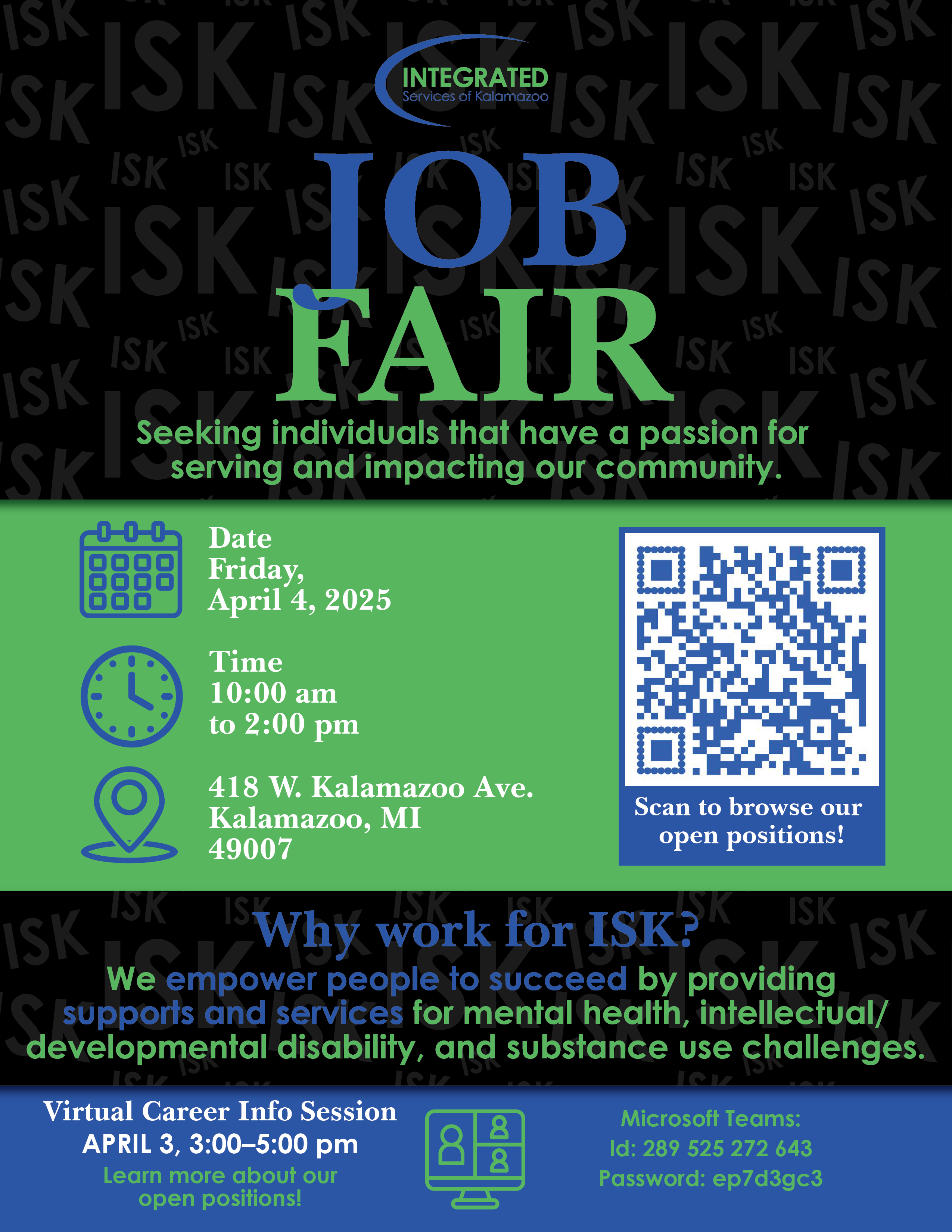 Integrated Services of Kalamazoo is looking for people who have a passion for serving and impacting our community! ISK is holding a Job Fair on Friday, April 4 from 10 a.m. to 2 p.m. at our 418 W. Kalamazoo Ave. location.